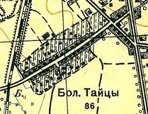 В пояснительном тексте к этнографической карте она записана, как деревня Dorf Gross Taiz (Большие Тайцы) и указано количество её жителей на 1848 год: 58 м. п., 64 ж. п., всего 122 человека[13]