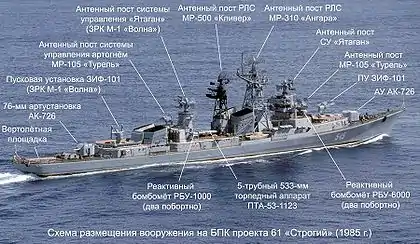 | Авиационная группа | 1 вертолёт Ка-25, ангар отсутствует (на пр. 61МЭ есть ангар для одного вертолёта вместо кормой артустановки), авиационные торпеды АТ-1М и авиационные глубинные бомбы ПЛАБ-250-120, ПЛАБ-50-64 и ПЛАБ-МК. |