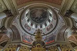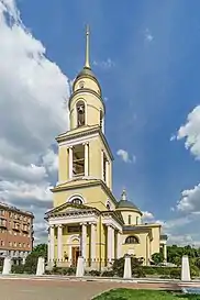 Здание в целом выполнено в стиле ампир. Основой является монументальный прямоугольный объём (четверик), украшенный боковыми портиками, в которых находятся боковые престолы: Сретения иконы Владимирской Божией Матери и Усекновения главы Иоанна Предтечи. Четверик завершается цилиндрическим световым барабаном с полусферическим золочёным куполом. Со стороны площади примыкает полукруглая апсида. Внутренняя часть церкви обладала прекрасной акустикой. Ныне здание является архитектурной доминантой площади.