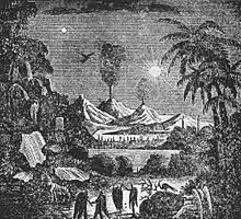 …Это был храм, имеющий форму равностороннего треугольника, стены его были сложены из полированного сапфира, или иного столь же великолепного синего камня, который сходно с сапфиром переливался миллиардами золотистых искр, поблескивавших и игравших в свете солнечных лучей (…) Крыша сделана была из некоего желтого металла и состояла из трёх частей, которые представляли собой отнюдь не треугольники, сходящиеся к центру, но дополнительно дробились, искривлялись и разделялись между собой, представляя таким образом картину бушующего пламени, начавшегося с единого очага возгорания и яростно пляшущими языками распространившегося во все стороны. Это архитектурное решение столь красноречиво говорило само за себя и было выполнено столь безукоризненно, чтобы его ни на минуту нельзя было принять за творение природы. Сквозь щели между этими металлическими языками пламени мы смогли рассмотреть шар из более тёмного и матового металла, по цвету схожего с медью, который внешние части закрывали собой и плясали вокруг, словно бы пытаясь поглотить и сжечь без остатка. (…) Что построившие его вдохновенные мастера хотели передать, изображая шар, окруженный языками пламени? Желали ли они подобным образом рассказать о катастрофе, постигшей в давние времена их мир, или предсказать катастрофу, ожидающую в будущем наш?