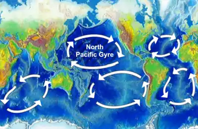 - «Попадая в поверхностные слои океана, пластик распространяется течениями и ветрами. Так, пластик, попадающий в воду в Японии, уносится на восток Субарктическим течением (в субарктических водах) и течением Куросио (в промежуточных водах, Каваи 1972; Фэйворит et al. 1976; Нагата et al. 1986). Таким образом, мусор перемещается из зон с высокой концентрацией в зоны с низкой концентрацией. Вдобавок к этому, экмановское трение — ветровая циркуляция океана — смещает весь водный массив к промежуточным водам (см. Родин 1970: фиг. 5). Из-за конвергентной природы слоя Экмана, в промежуточных водах плотность загрязнения обычно высокая. К тому же, слияние течений в Северо-тихоокеанской системе (Масузава, 1972) должно и там приводить к высокой концентрации мусора». Day, etc… 1988, p. 261 (Emphasis added)