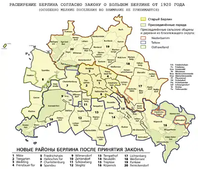 Закон о расширении границ Берлина (так называемый «закон о Большом Берлине», нем. Groß-Berlin-Gesetz был принят 27 апреля прусским ландтагом (164 — «за», 148 — «против») и вступил в силу 1 октября 1920 года. Согласно этому закону, в состав города Берлина включались шесть бывших внерайонных городов: Берлин-Лихтенберг, Берлин-Шёнеберг, Берлин-Вильмерсдорф (такие названия прилегающие к Берлину города Лихтенберг, Шёнеберг и Дойч-Вильмерсдорф получили ещё в 1912 году, хотя и оставались самостоятельными городами), Шарлоттенбург, Нойкёльн и Шпандау. Кроме того, в территорию Берлина вошли многочисленные поселения, отошедшие от прилежащих районов Нидербарним, Остхафельланд и Тельтов: город Кёпеник, 59 сельских общин и 27 земельный угодий. Кроме того, в Берлин вошёл земельный участок с берлинским Городским дворцом, который до тех пор являлся частным поместьем и не принадлежал никакой административной единице.