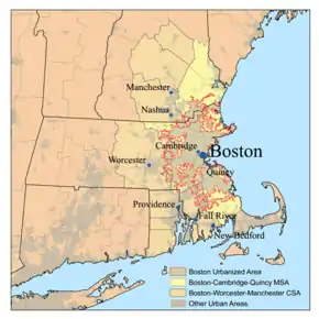 Тем не менее, численность населения всей области Бостона, включая Кембридж, Бруклайн[1][2], Куинси и другие пригороды, превышает 5,8 миллиона, в зависимости от подсчёта, количество жителей агломерации составляет от 4,5 до 8 млн.[3]