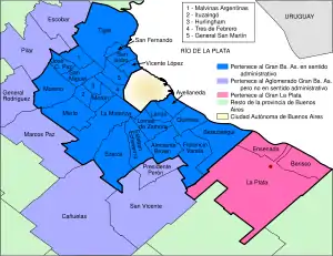 - Пригороды Буэнос-Айреса. Согласно определению Национального института статистики и переписей (INDEC), к ним входят 24 муниципалитета провинции Буэнос-Айрес[2], в частности: