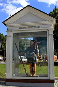 В 1861 году статую Большого Кристапа переместили в маленькое дощатое строение на берегу Даугавы, в самом начале Московской улицы. Этот участок располагался в непосредственной близости от помещений госпиталя Святого Георгия, одного из самых значимых центров городской благотворительности. Рядом со стеклянным покрытием, защищавшим статую Кристапа от непогоды, располагалась большая деревянная кружка для пожертвований, которые передавались в Георгиевский госпиталь. Крупные пожертвования обычно оставляли члены рижского братства перевозчиков, а также гостевые перевозчики, которые благодарили святого за благополучное преодоление опасных даугавских порогов.