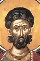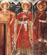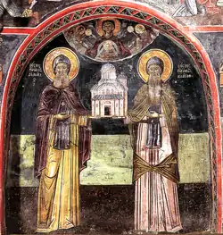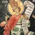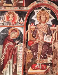 Композиция «Царь царем» помещена на западной стене, отделяющей помещение диаконов от основного храма. На ней изображён Христос в царских одеждах, сидящий на троне, к нему в молитве припадает Богородица со свитком в руках. На южной стороне помещено изображение Иоанна Предтечи. Рядом с ним изображены святые-воины Феодор Тирон и Феодор Стратилат, Георгий Каппадокийский, Димитрий Великий и Нестор в ценных одеждах принцев и экзотических головных уборах. Считается, что эта роспись создана под влиянием работ Феофана Стрелитзаса в монастыре Святого Николая.