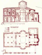Восточная стена храма выглядит так: византийская кладка и своды с двумя куполами, арками и наклонными крышами. Внешними особенностями храма являются кладка стен квадратными камнями, окруженными кирпичами через ряд. Эти тонкие кирпичи также окружают арки над окнами, заканчивающиеся зубцами и керамически-пластическими украшениями.