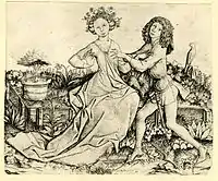 Среди работ Мастера E. S. есть несколько гравюр, иллюстрирующих тему Сада любви (L. 202—216), в том числе: «Шут и обнаженная девушка с зеркалом» (Narr und nacktes Mädchen mit Spiegel, L. 213), «Влюбленные на скамейке в саду» (Liebespaar auf einer Gartenbank, L. 211); «Праздник в Саду любви, или Большой Сад любви» (Lockere Gesellschaft; L. 215)[3]).