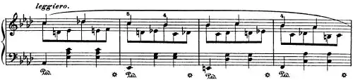 Самому вальсу предпосланы восемь тактов трели на ми первой октавы (такты 1—8). На фоне неё в басу сменяются сексты. Уже первая тема (9—40), в Ля-бемоль мажоре, должна удивить слушателя: рядом с обычным для вальса трёхдольным басом и трёхдольным же аккомпанементом в среднем голосе наверху разворачивается отчётливо двудольная мелодия. Она плавно спускается вниз и поднимается обратно, потом повторяется октавой выше. Ей на смену приходят быстрые пассажи, представляющие собою просто фигурации. Они становятся рефреном для всего вальса: между его повторениями (41—57, 73—88 и 105—120) помещены два близких по характеру эпизода (58—72 и 89—104), из которых второй намного решительнее и полнозвучнее. За третьим проведением рефрена внезапно начинается до-минорный средний эпизод (121—164). Он помечен sostenuto. Тема проводится два раза, усиливаясь, и затем на пике драматизма музыка уходит обратно в Ля-бемоль мажор. Реприза вводится рефреном (165—180), за ним следует первая (двудольная) тема (181—209). После трёх переходных тактов (210—212) нерешительности и раздумий возвращается рефрен (217—228). Как будто высвобождая всю свою энергию, он взлетает ввысь, но тут же, неторопливо паря, спускается. Повторяется только второй эпизод (229—260), с изменениями: между двумя его проведениями вставлена задумчивая гамма, прерывающая пляску. После второго проведения тема повторяется ещё раз, в Ре-бемоль мажоре, затем с помощью серии аккордов модулирует обратно. Возвращается рефрен (261—276), после которого вальс завершает стретта (277—289) на основе двудольной темы.
