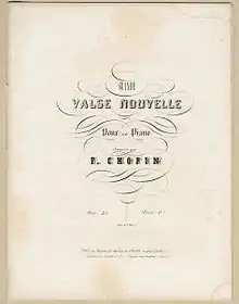 Вальс был издан летом 1840 года, как обычно, примерно в одно время в Париже (июнь; Пачини, изд. № 3708)[9], Лейпциге (август; Брейткопф и Гертель, изд. № 6419)[10] и Лондоне (июнь; Вессель, изд. № 3559)[11]. На обложке французского издания значится: «Новый большой вальс» (фр. Grande Valse Nouvelle), в немецком издании он назван просто вальсом. Английское издание, как это часто бывало у Весселя, вышло снабжённое не имеющим отношения к Шопену заголовком: «Сто и один»[12] (фр. Cent-et-Un). Однако на этот раз он не был выдуман издателем, а появился скорее по недоразумению. Пачини издавал большую серию «Сто и один» (вероятно, по образцу сборников новелл из жизни Парижа «Париж, или Книга ста и одного» (фр. Paris, ou le Livre des Cent-et-Un)[13], издававшихся Пьером-Франсуа Лядвока[14]), в которой вальс Шопена вышел под номером 68[15] (это обозначено на первой его странице). Именно по этой причине во французском издании такая странная на первый взгляд пагинация: вальс занимает страницы с 408 по 415. При подготовке английского издания «Сто и один» заняло место заголовка уже собственно вальса.