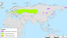 ![]() Гнездовой ареал Зимний ареал |
