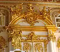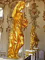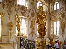 Но основным элементом декора, традиционным для растреллиевских интерьеров, является золочёная резьба по дереву. Выполнение работ относится к 1751 году; бригаду русских мастеров возглавлял Иосиф Шталмеер. Нижнюю часть лестницы украшают резные кариатиды, воссозданные в послевоенные годы по моделям скульпторов Г. Михайловой и Э. Масленникова. Самые заметные скульптуры верхней части — аллегорические изображения времён года, украшающие верхнюю площадку лестницы. Весна, Лето (на перилах), Осень и Зима (помещены в нишах напротив первых) представлены в образе юных девушек. Повторения скульптур «Весна», «Лето» и «Осень» также выполнили Г. Михайлова и Э. Масленников. Скульптура «Зима», в годы Великой Отечественной войны была эвакуирована и сохранилась. Дверной портал, ведущий в Танцевальный зал, решён в формах триумфальной арки. Украшением монументального десюдепорта служат две резные фигуры «Верность» и «Справедливость».. Портал воссоздан по моделям С. Лебедевой.