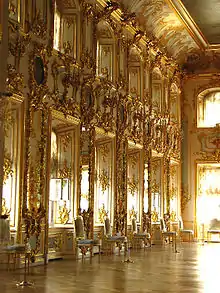 В отделке господствует золочёная резьба по дереву. В простенках между окнами, над зеркалами, расположены тондо на темы «Энеиды» Вергилия и «Метаморфоз» Овидия (работы Джузеппе Валериани; в настоящее время подлинных четыре; остальные двенадцать — копии, воссозданные взамен утраченных во время Великой отечественной войны). Падуги, создающие плавный переход от стен к потолку, украшены живописными медальонами и лепными кронштейнами. Плафон «Аполлон на Парнасе» (Бартоломео Тарсия, 1751 год), созданный специально для зала, занимает весь свод. Орнаментальный узор наборного паркета из клёна, ореха, светлого и тёмного дуба дополняет интерьер.