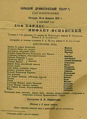 - 1919 — «Дон Карлос» Фридриха Шиллера; режиссёр А. Н. Лаврентьев
