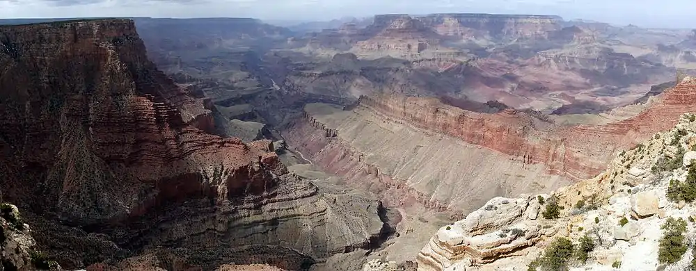 Большой каньон (Великий каньон, Гранд-Каньон; англ. Grand Canyon) — один из глубочайших каньонов в мире. Находится на плато Колорадо, штат Аризона, США, на территории национального парка «Гранд-Каньон», а также резерваций индейцев племен навахо, хавасупай и валапай. Каньон прорезан рекой Колорадо в толще известняков, сланцев и песчаников. Длина каньона — 446 км. Ширина (на уровне плато) колеблется от 6 до 29 км[1], на уровне дна — менее километра[1]. Максимальная глубина — 1857 м.