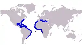 Вид распространён в тропической и субтропической части Западной Атлантики от берегов Новой Шотландии до Уругвая. В восточной части Атлантического океана ареал простирается от побережья Португалии до Анголы, а также включает Средиземное море.