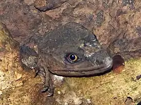 Общая длина достигает 24 см[2]. Имеет очень большую голову, плоское тело, очень тонкий и округлый хвост. Окраска спины бурого цвета с желтовато-коричневыми пятнами, окраска головы однородная. Конечности мощные и крепкие. Чешуя мелкая. Спина покрыта многочисленными бугорками.