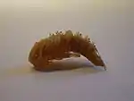 Личинка длиной до 2,5 см и более, голая, буровато-жёлтая, цилиндрическая, безглазая, с тремя парами грудных ножек, каждая ножка с коготком; усики 4-членистые, верхние челюсти на вершине раздвоенные. Задний членик тела конусовидный, кончается двумя крючками, направленными кверху; заднепроходное отверстие помещается на заднем краю предпоследнего членика на небольшом возвышении, перед которым находятся ещё две небольших бородавочки — всё это играет роль подталкивателя при передвижении личинки.