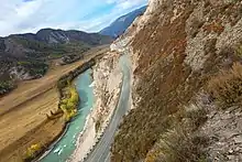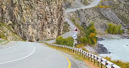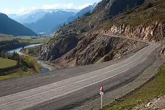 «…Уже через несколько минут подъехали к высокому Берт-бому. Местами на узких карнизах, нависших над клокочущим Чулышманом, сжатом здесь в узком ущелье, становится жутко.» (В.И. Верещагин)[6]