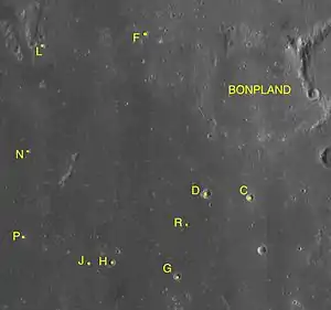 - Кратер Бонплан D примечателен тем, что его западную часть пересекает гряда, и его вал в этом месте двойной[6][7][8].
