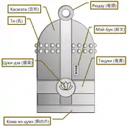 ![]() Бонсё из Рёан-дзи, на котором спереди хорошо видно цуки-дза, ударную панель в форме лотоса, а сзади — подвешенное бревно для ударов по колоколу, сю-моку. | |