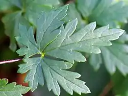 Листья плотные, без опушения, глубоко пяти—семи-рассечённые, с ромбическими сегментами; стеблевые менее, прикорневые более глубоко надрезанные с короткими зубцами.