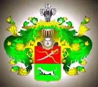 Щит разделён на две части: в верхней части в красном поле золотые лук и меч, положенные крестообразно; а в нижней в зелёном поле собака белого цвета.