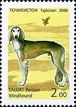 Салюки — довольно крупная, изящная собака с узкой головой, нежными глазами и удлинёнными ушами. Хвост закручен на конце. В различных бедуинских племенах сформировались два типа салюки: гладкая и «с перьями», у последних есть длинная шелковистая шерсть на ушах и подвес на хвосте. Окрасы любые, за исключением пегих. В Европе клуб любителей салюки создан в 1923 году в Англии, порода признана FCI в 1966 году[29].