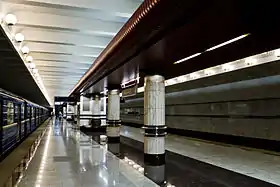 В вестибюлях запроектирован глянцевый реечный потолок темно-коричневого цвета, который на платформе трансформируется в центральный карнизный элемент.