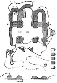 Планы раскопок Борисоглебского собора (1908 год): слева — В. А. Попов, справа — И. И. Орловский(?) | ||||||||||