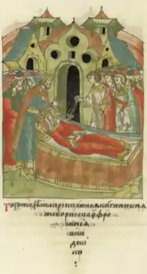 ![]() Смерть княгини Ефросинии, князь Борис Туровский у её постели | |