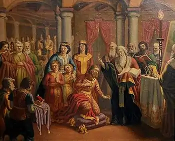 В то время монах по имени Мефодий написал картину «Страшного Суда» в одном из любимых домов царя. Борис хотел заказать картину на любимую им тематику охоты, однако монах отклонил просьбу и настоял, что тему выберет по своему усмотрению. Борис согласился, но с условием, чтобы картина вводила зрителей в страх и изумление. Это условие Мефодий исполнил: при виде законченной картины Бориса охватил страх перед Богом. Как утверждает летописец, это и стало окончательным аргументом в пользу принятия крещения[4].