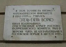 - В Ростове-на-Дону на фасаде здания Ростовского педагогического института укреплена мемориальная доска в честь Этель Борко.