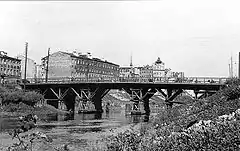 В 1881—1882 годах на средства Новой бумагопрядильной фабрики был построен деревянный подкосный мост, работы велись под наблюдением инженера А. И. Штукенберга[4]. 21 июня 1882 года мост был принят в ведение города[5]. В 1899 году, в виду неудовлетворительного состояния моста, была произведена его перестройка. Контроль за работами осуществляла особая комиссия городской Управы в составе: М. Ф. Еремеева, И. Н. Иорса, П. В. Фетисова, старшего техника М. Ф. Андерсина, инженеров П. А. Лихачева и А. А. Экарева и техника Крюгера[6]. Мост был пятипролётный на высоких свайных опорах башенного типа. Центральный пролёт был ригельной системы; с двух его сторон располагались по два 6,4-метровых пролёта треугольно–подкосной конструкции. Длина моста по настилу равнялась 52 м, а общая ширина — 13 м, в том числе проезжая часть составляла 9 м, тротуары — по 2 м. Конструкция деревянного Борового моста была редким примером совмещения в одном переходе пролётных строений разных систем[7].