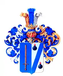 Щит рассечён. В правой лазоревой части золотой меч вертикально остриём вверх. В левой серебряной части лазоревая перевязь слева, сопровождаемая вверху и внизу двумя горящими гранатами.