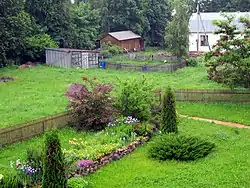 Находящийся неподалёку от церкви господский дом Воейковых был перестроен «дворец деревянный, двухэтажный, на каменном жилье, крытый железом»[8] по проекту архитектора Александра Ивановича Резанова[18], а территория вокруг дворца преобразована из Бородинской помещичьей усадьбы в дворцово-парковый ансамбль в котором был заложен английский сад[20] на площади 2262 кв. сажени, ограниченный Беззубовской и Смоленской дорогами, дорожкой к церкви и верхней террасой с дворцом[4]. Для постоянного ухода за дворцом и усадьбой в целом были определены два отставных унтер-офицера, дворовой человек, скотник с женою и сельский староста[4]. Во дворце находились книги и карты, связанные с Бородинским сражением[20]. Рядом со дворцом по одинаковым проектам были построены «три кавалерские дома (или флигели) на каменном фундаменте, с мезонинами», а также хозяйственные объекты включали кладовую, флигель на каменном жилье для кухни и кондитерской, сарай, конюшню и кладовую[8][20]. Из старых построек были переделаны скотный двор с двумя избами, погребом и молочной, хлебный запасной магазин с закромами[20]. «В саду» была возведена «столовая зала» для торжественного обеда, который давал Николай I многочисленным гостям юбилейных торжеств 1839 года[20]. Вдоль Большой Смоленской дороги по отдельному проекту, «частью из старого» было построено 10 крестьянских изб с воротами и заборами[20]. Возведены были также временные сооружения «кухня, с пекарнею и прочими службами; прачешная, с сушильнями и прочими службами; ледник с пятью разделениями»[20]. Церковь в селе также была восстановлена и освящена в честь Смоленской иконы Божией Матери[18][21].