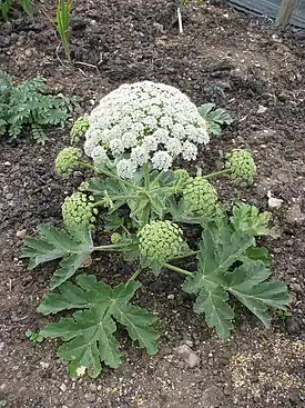 Травянистый двулетний или многолетний моно- и поликарпик. Высота — до 1 м, стебель бороздчатый, опушенный, листья простые, в очертании почти округлые или широко яйцевидные, перисто-лопастные, лопасти продолговато-яйцевидные, по краю крупно городчато зубчатые, верхние листья с сильно расширенным опушенным, по краю обычно зубчатым влагалищем и 3-лопастной пластинкой, листья с верхней стороны голые или рассеяно-опушенные мельчайшими прижатыми волосками, с нижней стороны более или менее густо-бело-войлочно-опушенные. Зонтики крупные, многолучевые, лучи зонтика и зонтичков мелко шероховато-опушенные, цветки белые, внешние лепестки краевых цветков в зонтичках увеличенные[2][3].
