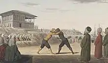 В то же время, в качестве состязания борьба сохранялась как национальный вид спорта — разный у разных народов, — и состязания по борьбе проводились во время праздников, как религиозных (в Европе несмотря на запреты церкви), так и общинных. Необходимо отметить, что в основном прикладная борьба отличалась от народных состязаний: если первый вид был направлен на фактическое поражение противника (смерть, телесные повреждения или взятие в плен), то второй вид не всегда, но как основное правило имел лишь символический, спортивный результат (касание земли какой-либо частью тела, сдачу)[12]