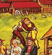 Интерес представляет и такое прикладное значение борьбы, как её применение в разрешении конфликтов, в качестве ритуального поединка. Посредством схватки борцов по определённым правилам мог быть решён конфликт как между двумя людьми (судебный поединок), так и конфликт даже между нациями. Так, в Повести временных лет описывается пример такого разрешения конфликта между печенегами и войском князем Владимира в 992 году. Предводитель печенегов предложил князю разрешить спор поединком двух борцов. Против печенежского борца (который был «превелик зело и страшен») вышел, по мнению большинства исследователей Никита Кожемяка, «середний телом» и «почаста ся крепко держати, и удави печенезина в руках до смерти, и удари имь о землю»[27]. Сложно сказать, какой приём использовал Кожемяка, но очевидно, что он провёл какой-то бросок с падением противника на землю.