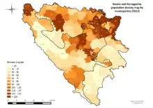 По предварительным результатам переписи 2013 года средняя плотность населения составила 74,8 человек/км², в Федерации Боснии и Герцеговины — 90,9 человек/км², в Республике Сербской — 53 человека/км². При этом наибольшая плотность населения присутствует в центральных районах и на севере страны[73]. Население сосредоточено в долинах рек, горные районы заселены слабо. Доля городского населения в 2003 году составила 43 %. В 2001 году в экономике было занято более 1 миллиона человек[20].