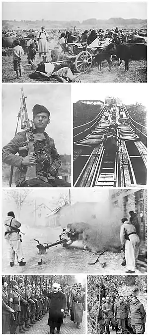 Слева направо сверху вниз: Беженцы во время Битвы на Козаре, 1942 год; Четник Динарской дивизии; Бойцы 2-й Пролетарской бригады преодолевают Неретву по разрушенному мосту, март 1943 года; Немецкие артиллеристы в бою с партизанами, Босния; Смотр боснийских добровольцев СС, ноябрь 1943 года; Иосип Броз Тито (первый справа) и его соратники в Дрваре, 14 мая 1944 года. | |||||||||||||