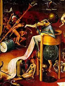 Босх был необычайно изобретателен в изображении Дьявола, грешников и всего мира зла. В его работах можно наблюдать все приемы, с помощью которых европейские живописцы демонизировали врагов Христа и христианства. Специалисты отмечают специальный «диалект», созданный Босхом для этой цели и не всегда понятный современному зрителю[10].