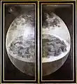 Закрытые створки самого известного триптиха Иеронима Босха иллюстрируют библейский сюжет «Сотворения мира»: «В начале сотворил Бог небо и землю. Земля же была безвидна и пуста, и тьма над бездною, и Дух Божий носился над водою.» (Быт. 1:1-2). Сам триптих получил название по теме центральной части, где по мнению искусствоведов изображён «Сад земных наслаждений» (1500—1510). Открытая левая створка посвящена созданию Творцом Адама и Евы; среди райской живности есть пьющий воду единорог, который для первых христиан был неразрывно связан с девственной Марией, и есть изображение жирафа, экзотического для Европы животного, впервые привезённого на континент лишь в 1826 году. Открытая правая створка — из-за обилия музыкальных инструментов — прозвана «музыкальным адом». [9]