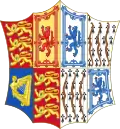 Щит, увенчанный короной британской империи, окружён лентой ордена Подвязки (в лазоревом поле золотая надпись Honi soit qui mal y pense [Пусть стыдится подумавший плохо об этом])[113] и объединяет британский королевский герб и герб отца Елизаветы графа Стратмора. Справа британский королевский герб; щит четверочастный: в первой и четвёртой частях — в червлёном поле три золотых вооружённых лазурью леопарда (идущих льва настороже), один над другим [Англия]; во второй части — в золотом поле червлёный, вооружённый лазурью лев, окружённый двойной процветшей и противопроцветшей внутренней каймой [Шотландия]; в третьей части — в лазоревом поле золотая с серебряными струнами арфа [Ирландия])[115]. Слева герб графа Стратмора; щит четверочастный: в первой и четвертой частях — в серебряном поле лазоревый вооружённый червленью лев, окружённый двойной процветшей и противопроцветшей внутренней каймой [Лайоны]; во второй и третьей частях — в горностаевом поле три охотничьих лука [Боузы][114].