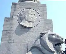 Щитодержатели: на зелёной лужайке, процветшей на одной ветке Розой Тюдоров, Трилистником и Чертополохом, справа золотой, вооружённый червленью и коронованный короной Британской империи леопард [восстающий смотрящий впрямь лев][113]; слева восстающий красный (низ) с золотом (верх) вооружённый червленью и золотом леопард[114].