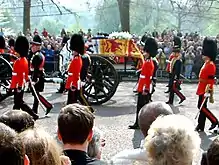 В день похорон в Лондоне более миллиона человек заполнили район, прилегающий к Вестминстерскому аббатству, и 23 мили (37 км) на протяжении маршрута похоронной процессии от центра Лондона до места последнего упокоения королевы-матери в часовне Святого Георгия в Виндзорском замке, где ранее были похоронены супруг и младшая дочь Елизаветы[107]. По желанию покойной похоронный венок, лежавший на крышке гроба Елизаветы, был возложен на могилу неизвестного солдата, повторяя жест, который сама королева-мать сделала в день своей свадьбы за 79 лет до того[108].