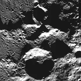 ![]() Снимок зонда Lunar Reconnaissance Orbiter. Кратер Бош в тени в верхней части снимка, в центре нижней части снимка сателлитный кратер Рождественский U. | |