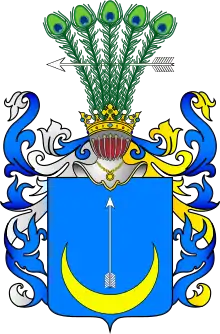 В лазуревом поле серебряная стрела над золотым, рогами вверх, полумесяцем. Щит увенчан дворянскими шлемом и короною. Нашлемник: Пять павлиных перьев, пронзенных в пояс серебряною стрелою. Намет: справа — лазуревый, с серебром, слева — лазуревый, с золотом.