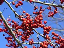 Плоды — мелкие яблоки, собраны в пониклые, густые гроздья, шаровидные, диаметром 3—7 мм, ярко-красные или оранжевые с сизым налётом. Косточек 4—5, эллипсоидальных, длиной 1,5—3 мм, на спинной стороне бороздчатых.
