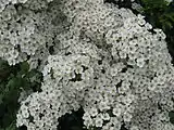 Соцветия прямостоящие, диаметром до 5 см, довольно компактные, 10—18-цветковые, с голыми или рассеянно волосистыми осями, цветоножками и гипантиями. Цветки диаметром 1,5 см, с белыми лепестками; чашелистики продолговато-треугольные или широко-яйцевидные с притуплённым кончиком, отогнутые при плодах; тычинок двадцать, с красными пыльниками; столбик один.